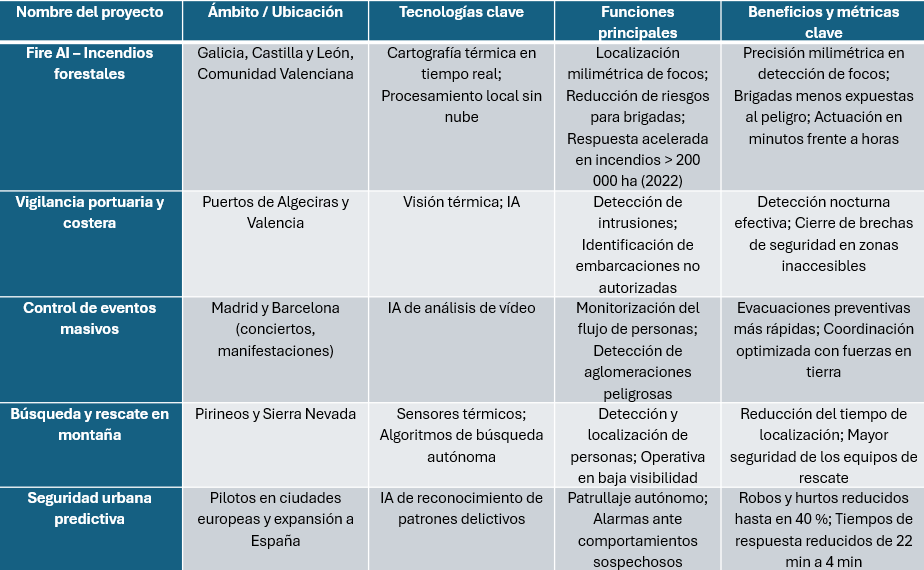 • Eventos masivos: En el Carnaval de Cádiz 2025, drones con IA de análisis de multitudes identificaron un cuello de botella en la Plaza de San Juan de Dios y permitieron reconfigurar accesos en menos de 5 minutos, evitando incidentes.